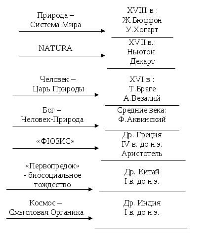 Экологические проблемы в их теоретическом и практическом аспектах выстраиваются в основном вокруг концепции взаимодействия Человечества и Природы. Своеобразие той или иной культуры в концентрированном виде проявляется через доминирующее в ней представление о Человеке и его месте в обществе и в целом в окружающем его мире. В биосфере конкурируют за экониши более трех тысяч видов культур, и каждая со своим мировоззрением, включающим концепцию Человека и Природы в глобальных масштабах. Так, например, культура Древнего Египта – образец гармонии человека и природы. Египетские храмы создавались в едином ансамбле с природой, но в то же время так, чтобы они утверждали силу и величие Человека-Творца. В философских учениях древних Индии и Китая характерным было субстанционально-генетическое тождество природы и человека. Территории Индии и Китая в древности населяли родовые общества, в которых природа воспринималась как органическое и социальное тело рода, а сам род воспринимался как природное тело. В своеобразном биосоциальном теле рода соединялись в неразрывное единство целостная сущность природы и социоантропоморфная сущность рода. Мировоззренческая интерпретация биосоциального тождества природы и человека привела к выделению основных направлений в древнеиндийской и древнекитайской философии и к построению гносео-онтологической структуры философского знания. Интеллектуальная традиция древнегреческих философских учений также имела своим основанием единую картину мира, цельного во всех своих взаимосвязях, где не было пропасти между человеком и Миром Природы.