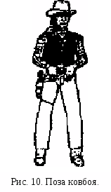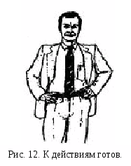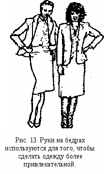Самым агрессивным сексуальным проявлением мужчины по отношению к женщине будет вызывающий жест - закладывание больших пальцев рук за ремень, чтобы акцентировать область гениталий (см. рис. 10). Он может также развернуть к ней свое тело и поставить ногу носком в ее сторону. Он смотрит интимным взглядом и задерживает свой взгляд на долю секунды дольше положенного. Если он по-настоящему заинтересован, зрачки его глаз будут расширяться. Часто он стоит держа руки на бедрах (рис 12), чтобы подчеркнуть свою физическую силу и показать готовность к взаимодействию с этой женщиной. Если он сидит или опирается о стену, он может вытянуть ноги, чтобы выделялась область гениталий.