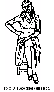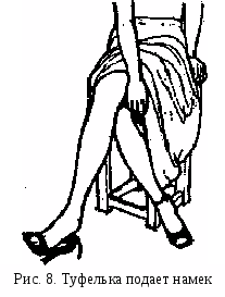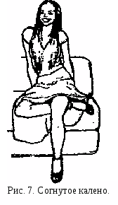 Первое - согнутое колено (рис. 7). В этом случае женщина сидит, подогнув одну ногу под другую и направив острие колена на того человека, к которому она проявляет интерес. Это очень свободная поза, исключающая всякие формальности и дающая возможность кокетливо обнажить колени.