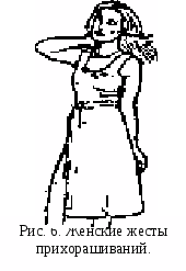 Женщины используют те же самые жесты прихорашиваний, что и мужчины, включая прикосновения к волосам, поправление одежды, одна или обе руки на бедрах, ноги и тело повернуты в сторону мужчины, продленный интимный взгляд и учащенный контакт глаз. Они могут также применять жест с закладыванием больших пальцев за пояс, который является чисто мужским, но женщины используют его более утонченно; только один большой палец закладывается за пояс, в сумочку или в прорезь кармана.