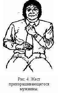 Мужчина начинает прихорашиваться при виде женщины, которая ему правится, аналогичным образом с тем, как это происходит у животных. В дополнение к тем автоматическим психологическим реакциям, о которых мы уже говорили, появятся новые жесты - руки его потянутся к шее, чтобы поправить галстук. Если он не носит галстук, он может поправить воротничок или смахнуть несуществующую пыль с плеча, поправить запонки, рубашку, пиджак или другой предмет туалета. Он может также пригладить волосы, чтобы выглядеть привлекательнее.