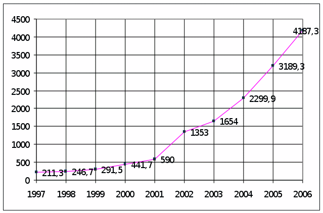 Рисунок 1. Динамика кредитных вложений коммерческих банков в 1997—2006 гг в целом по России (млрд руб.)30