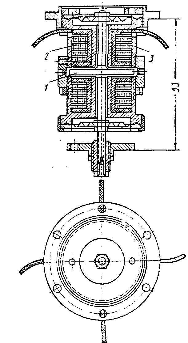 Действие датчика основано на преобразование линейного перемещения в изменение индуктивности его обмоток путем воздействия на подвижный элемент магнитной системы - якорь(1).Обмотки(2) датчика включены в фазочувствительный мост с выпрямителем, собранный по кольцевой схеме .(Рисунок 1)