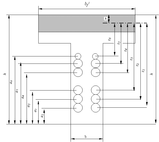 Вначале необходимо вычислить геометрические характеристики поперечного сечения балки в середине пролета. Для этого фактическое сечение балки заменяем расчетными (рис.13.1)
