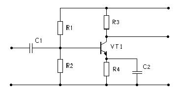 Эта схема представляет собой усилитель мощности на биполярном транзисторе, включенном по схеме с ОЭ. Переходной конденсатор C1 пропускает во входную цепь переменную составляющую напряжения источника сигнала и не пропускает постоянную составляющую. Блокирующий конденсатор C2 шунтирует резистор R4 по переменному току, исключая тем самым отрицательную обратную связь по переменным составляющим. Отсутствие конденсатора C2 привело бы к уменьшению усиления каскада. В области низших частот на работу усилителя оказывают влияние переходной и блокирующий конденсаторы, в области высших частот – частотная зависимость коэффициента тока базы, коллекторная емкость и емкость нагрузки.