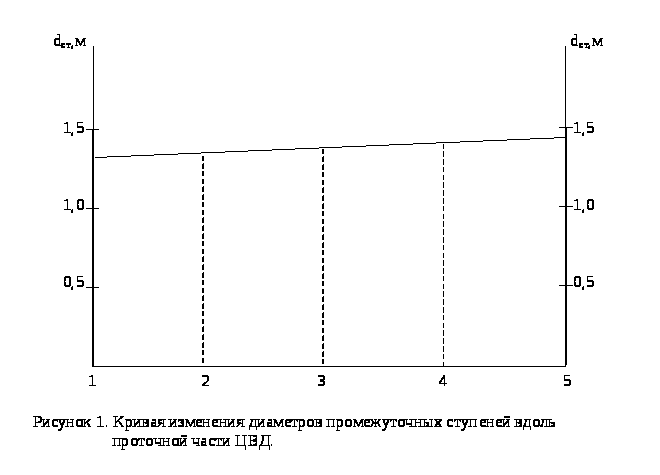 Строим кривую изменения диаметров вдоль проточной части ЦВД. По оси абсцисс откладываем произвольные равные отрезки. На пересечении с кривой изменения диаметров, получаем примерные диаметры промежуточных ступеней (см. рис. 1).