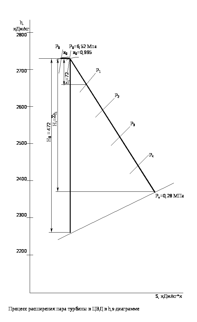 При построении процесса расширения в h,s-диаграмме принимаем потери давления в стопорных и регулирующщих клапанах равными 4 % от Р>0>:
