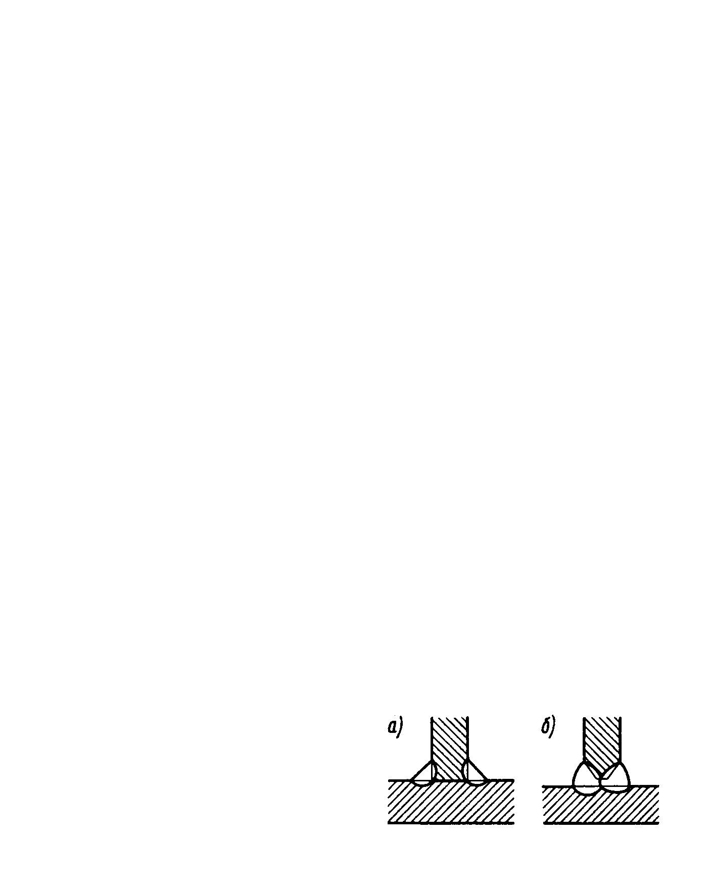 Рис4. Тавровые соединения. При электроннолучевом испарении металла а)Угловые б)Стыковые. его поверхность бомбардируют электронами. При этом испаряется только сам металл, не загрязняясь никакими посторонними примесями. Испарению (и осаждению) таким методом поддаются нелетучие и тугоплавкие соединения — оксид алюминия, оксид кремния, стекло, карбиды металлов. Вакуумное осаждение тончайших пленок незаменимо для получения интегральных схем микроэлектроники.