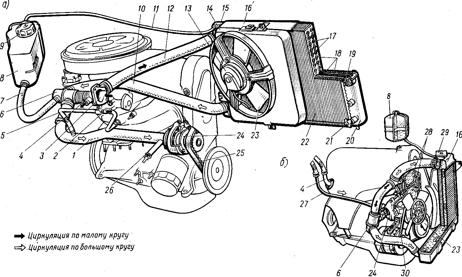 а—ВАЗ-2108; б—ВАЗ-2105; / — подводящая труба насоса; 2 — шланг отвода охлаждающей жидкости к карбюратору; 3 — выпускной патрубок головки цилиндров; 4 — патрубок подвода жидкости к отопителю; 5 и 27— шланги отвода жидкости соответственно от блока подогрева карбюратора и от отопителя; 6 — термостат; 7и 11 — шланги соответственно от бачка к термостату и от бачка к радиатору; 8 — расширительный бачок (компенсационный); 9 — пробка расширительного бачка; 10 и 12 — соответственно отводящий и подводящий шланги радиатора;