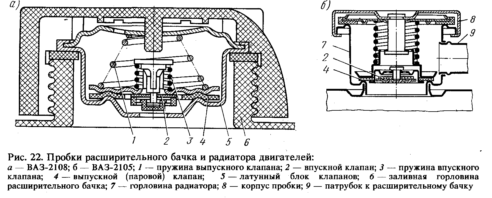 патрубок бачка шлангом 7 соединяется с дополнительным патрубком термостата 6. Заливная горловина бачка герметически закрыта пробкой (рис. 2). В пробке расширительного бачка помещаются два клапана: выпускной (паровой) клапан 4, который открывается при избыточном давлении в системе охлаждения до 20 кПа и выпускает часть паров в атмосферу; впускной клапан 2 (воздушный), который открывается при понижении давления в системе до 95 — 86 кПа (разрежение) вследствие остывания или слива жидкости и пропускает в систему охлаждения атмосферный воздух.