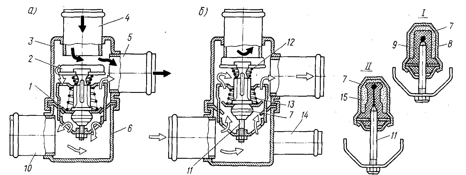 12 я 13 — пружины соответственно перепускного и основного клапанов; 14 — патрубок для присоединения верхнего шланга расширительного бачка; 15 — твердый наполнитель; / и // — положения термочувствительного элемента термостата при температуре охлаждающей жидкости соответственно менее и более 80 °С (стрелки означают то же, что и на рис. 1)