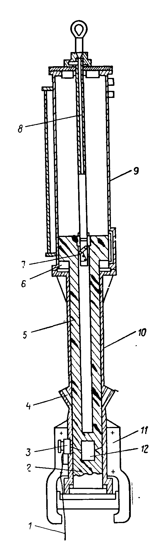 / — канат управления топливным насосом; 2—шабот, 3 — топливный насос высокого давления; 4 — выхлопной патрубок; 5 — поршень; 6— пневмовакуумный буфер; 7—рычажный механизм подъемного устройства; 8 — подъемное устройство; 9—направляющая труба; 10—рабочий цилиндр; 11 — устройство для крепления к пîãðужаемому элементу; 12 — камера сгорания
