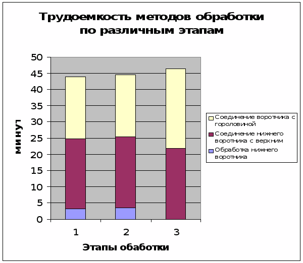 Была составлена технологическая последовательность обработки воротника в мужском пальто тремя способами. Был выбран самый рациональный метод обработки узла по трудоемкости Тобщ =43,8 мин., структуре операций, виду обарудования и средствам малой механизации.