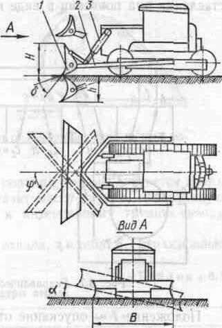Различают бульдозеры: 1) с неповоротным отвалом; последний закрепляется жестко перпендикулярно продольной оси машины. Такие бульдозеры применяют для устройства выемок, возведения насыпей, планировки площадок, разработки и засыпки траншей; 2) с поворотным отвалом; отвал может поворачиваться на угол <р' в горизонтальной плоскости и на угол а в вертикальной плоскости, что позволяет перемещать грунт не только вперед, но и в сторону. Этими бульдозерами можно нарезать террасы на косогорах, засыпать траншеи, расчищать дороги от снега.