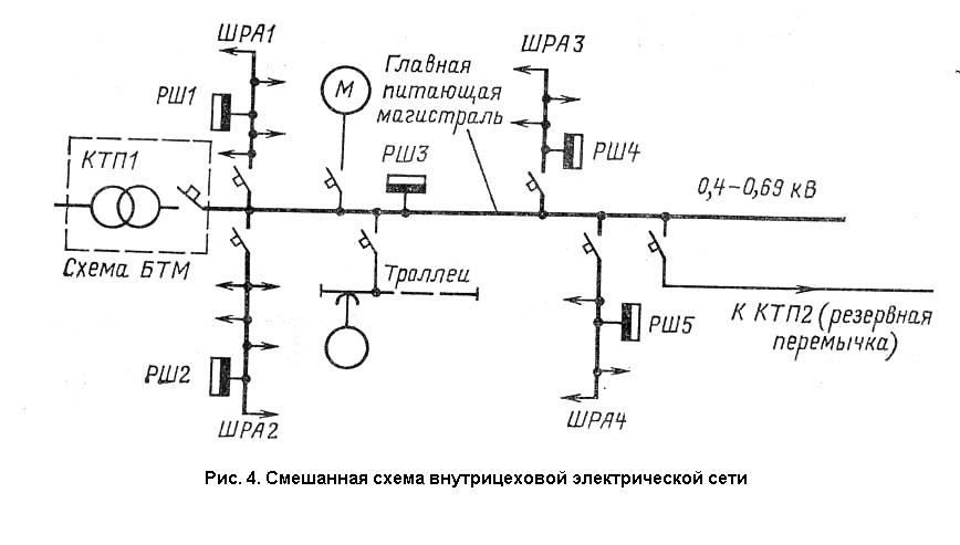 Сети напряжением до 1 кВ служат для распределения электроэнергии внутри цехов промышленных предприятий, а также для питания некоторых ЭП, расположенных за пределами цеха на территории предприятии. Цеховые электрические сети напряжением до 1 кВ являются составной частью СЭС промышленного предприятия и осуществляют непосредственное питание большинства ЭП. Схема внутри цеховой сети определяется технологическим процессом производства, планировкой помещений цеха, взаимным расположением ТП, ЭП и вводов питания, расчётной мощностью, требованиями бесперебойности электроснабжения, технико-экономическими соображениями, условиями окружающей среды.