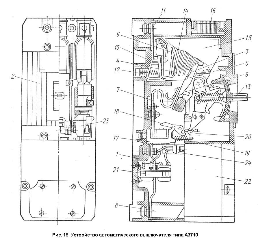 В случае КЗ якорь 18 расцепителя действует на отключающую рейку 20, освобождает защёлку и происходит автоматическое отключение; полупроводниковый блок защиты 22 при перегрузках подаёт сигнал на независимый расцепитель, якорь которого действует на отключающую рейку 20.
