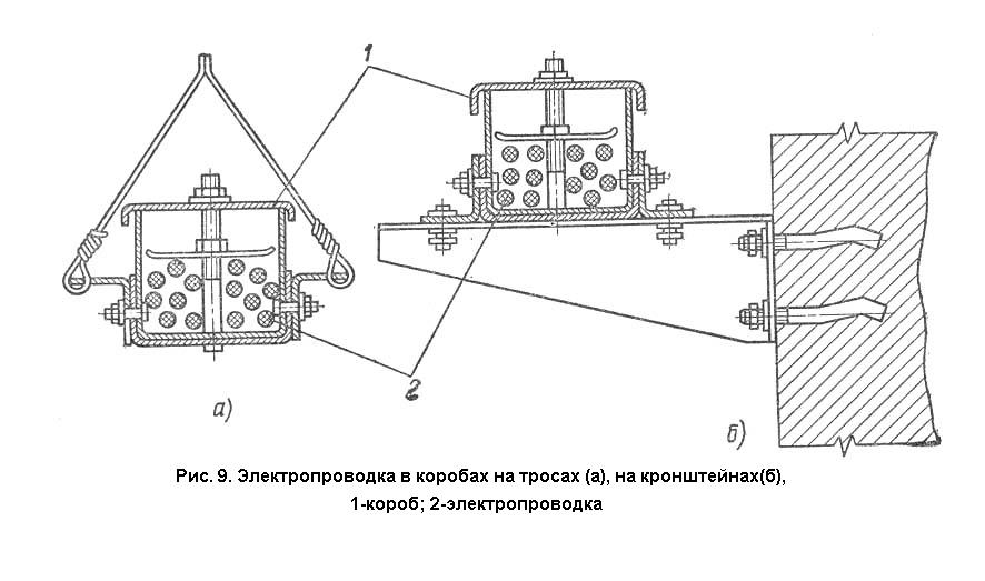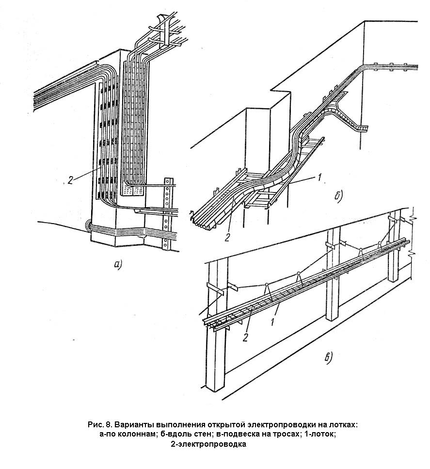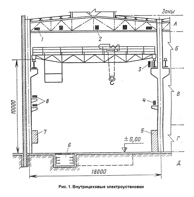 На (рис 1), представляющем собой поперечный разрез пролёта производственного помещения цеха, показаны открытые шинные магистрали 1, расположенные в верхней зоне (А) цеха. Там же установлен осветительный шинопровод 2. На капители колонны в зоне (Б) расположен троллейный шинопровод 3 для питания нагрузок мостового крана, по конструкциям вдоль стены цеха в зоне (В) размещены распределительный 4 и магистральные 8 шинопроводы. В цехе в зоне (Д) имеется кабельный канал 6 для прокладки внутрицеховых кабелей, распределительный шкаф 5 для питания силовых электроприемников и осветительный щиток 7 зона (Г).