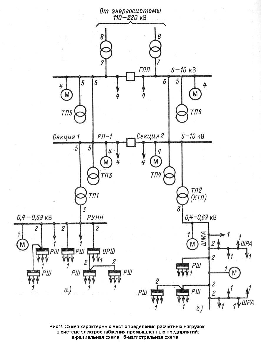 Характерным примером радиальной схемы является (рис 2 а). Здесь от секции 1 распределительного пункта РП-1 напряжением 6-10 кВ потребители НН через трансформатор получают питание отдельными линиями, отходящими от РУНН подстанции ТП1. Радиальные схемы применяют при наличии групп сосредоточенных нагрузок с неравномерным распределением их по площади цеха, во взрыво- и пожароопасных цехах, в цехах с химически активной и аналогичной средой. Радиальные схемы нашли широкое применение в насосных и компрессорных станциях, на предприятиях нефтехимической промышленности, в литейных и других цехах. Радиальные схемы внутрицеховых сетей выполняют кабелями или изолированными проводами. Они могут быть применены для нагрузок любой категории надёжности.