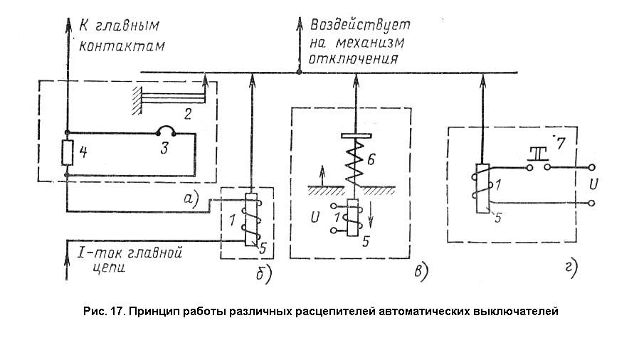 Основными элементами автоматических выключателей, выполняющими его защитные функции при анормальных режимах в цепи, являются расцепители, при срабатывании которых автоматический выключатель отключается мгновенно или с выдержкой времени. Автоматический выключатель может иметь один или несколько расцепителей.