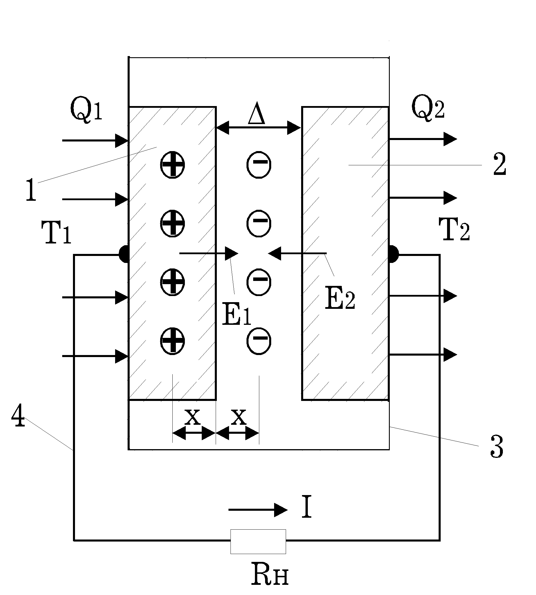 Процесс преобразования энергии в ТЭП рассмотрим вначале на примере анализа плоской вакуумной модели элементарного генератора (рис. 1.) Промежуток D между металлическими электродами - катодом (эмиттером) 1 и анодом (коллектором) 2, заключенными в вакуумный сосуд 3, откачан до давления 0,133 мПа (примерно 10-6 мм рт. ст.). Электроды и их выводы 4 изолированы от стенок сосуда. К эмиттеру подводится тепловая энергия Q1, и он нагревается до температуры Т1 » 2000К. Коллектор поддерживается при температуре Т2 < Т1 вследствие отвода от него тепловой энергии Q2. Распределение электронов по энергиям в металле электрода зависит от его химической природы и определяется среднестатистическим уровнем Ферми. Это тот (наименьший) уровень, на котором располагались бы все электроны при температуре Т=0. Если Т>0, то вероятность наличия у электрона энергии уровня Ферми всегда равна 0,5. Вплоть до точки плавления металла уровень Ферми мало зависит от Т.