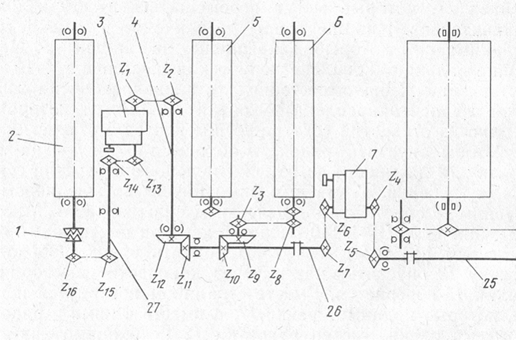 Механизм съема наработанного сновального вала и подачи к пинолям пустого приводится в действие от реверсивного электродвигателя 1 с помощью червячной пары, однозаходного червяка, который поворачивает зубчатый сектор, находящийся на валу 10. Электродвигатель 1 включается с помощью одной из двух кнопок: под действием одной из них производится подъем пустого вала, под действием другой – опускание полного сновального вала.