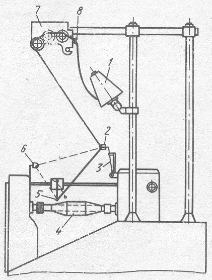 Нить сходит с бобины 1, установленной на 6обинодержателе, проходит через кольцо 8 баллоноограничителя, двухзонный шайбовый нитенатяжитель 7, глазок 2 сигнального крючка 3 механизма самоостанова при обрыве нити, глазок водка нитераскладчика 5 и наматывается на вращающуюся шпулю 4.