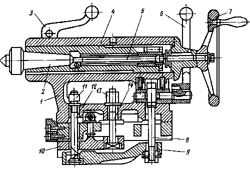 7) перемещается пиноль 4, закрепляемая