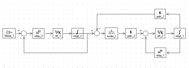 Parameters: =========== forder_1`k 1.139 forder_1`tau 0.038 gain_3`p 1.305 gain_2`p 1.305 relay_2`min -142.756 relay_2`max 142.756 relay_1`min -106.918 relay_1`max 106.918 att_2`d 0.125 att_1`d 2 fileinp_1`filename c:\d\data1.txt fileinp_1`col 1 |