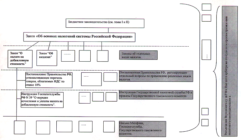 Таким образом, российское налоговое законодательство может быть представлено в виде следующей классификационной схемы (см. рис. 8) [Необходимо отметить, что в схеме не отражены указы Президента РФ. Это объясняется тем, что спектр бюджетных и налоговых проблем, по которым издаются указы Президента, достаточно широк и в классификационной схеме, используемой для учебных целей отразить четко место этих указов достаточно сложно (примечание автора).]