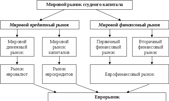 Мировой кредитный рынок – специфическая сфера международного движения ссудного капитала между странами на условиях возвратности и уплаты процента, где формируется спрос и предложение на заемный капитал. Традиционно разграничивались рынок краткосрочных ссудных капиталов (денежный рынок) и рынок средне- и долгосрочных капиталов (рынок капиталов). Мировой денежный рынок – это краткосрочные депозитно-ссудные операции от 1 дня до 1 года, главным образом между крупными банками. Основные условия кредита оговариваются по телефону. С конца 50-х годов как его подструктура возник рынок евровалют, на котором евробанки осуществляют в основном депозитно-ссудные операции в иностранных валютах, принадлежащих нерезидентам стран-эмитентов этих валют (например, доллары на счетах иностранных банков в США и за рубежом).
