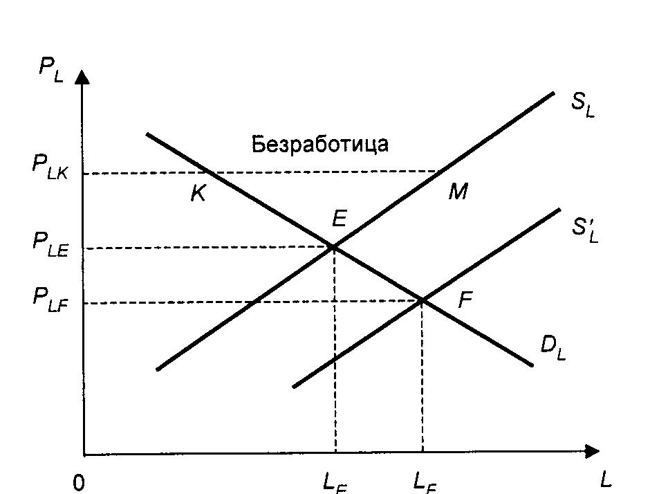 Соединив графики спроса и предложения, получим неоклассическую модель рынка труда, показывающую, что все желающие работать могут найти работу при сложившейся равновесной ставке заработной платы РLE. Если предложение труда возрастает (сдвиг кривой SL в положение S’L), то это приводит к снижению заработной платы до РLF и равновесие на рынке труда устанавливается в точке F.