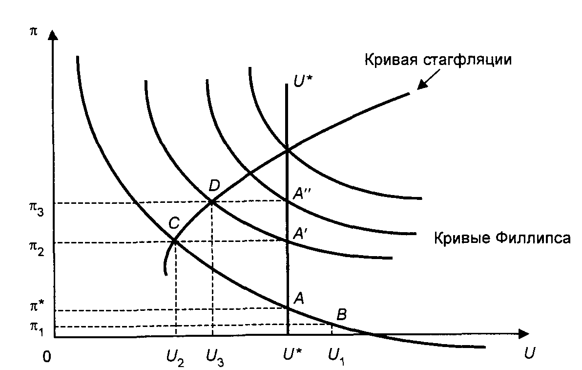 Своими действиями государство провоцирует не только рост цен, но и повышение безработицы. Кривая, проходящая через точки С, D является кривой стагфляции.