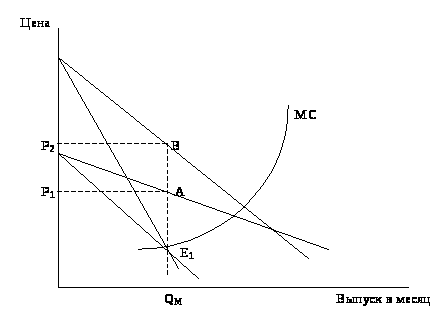 На графіку 3 показана ситуація, коли попит на монопольний продукт виріс з D>1> до D>2>. До збільшення попиту монополія продавала кількість товару Q>M>, що відповідає крапці Е>1>, у якій крива граничного доходу MR>1> перетинає криву граничних витрат монополії. Щоб продати така кількість товару монополіст вибирає ціну Р1, що відповідає крапці А на кривій попиту D>1>. При цій ціні кількість товару, на яку пред'являється попит, дорівнює максимизирующему прибуток випуску в Q>M> штук на місяць.
