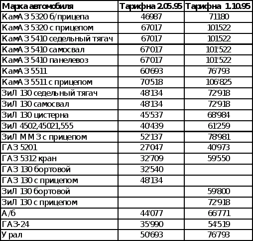 На основании данных о себестоимости предприятие выводит тариф за пользование автомобилем. Тариф за пользование автомобилем на 2 мая 1995 года и на 1 октября 1995 года приведен в таблице (см.табл.5).