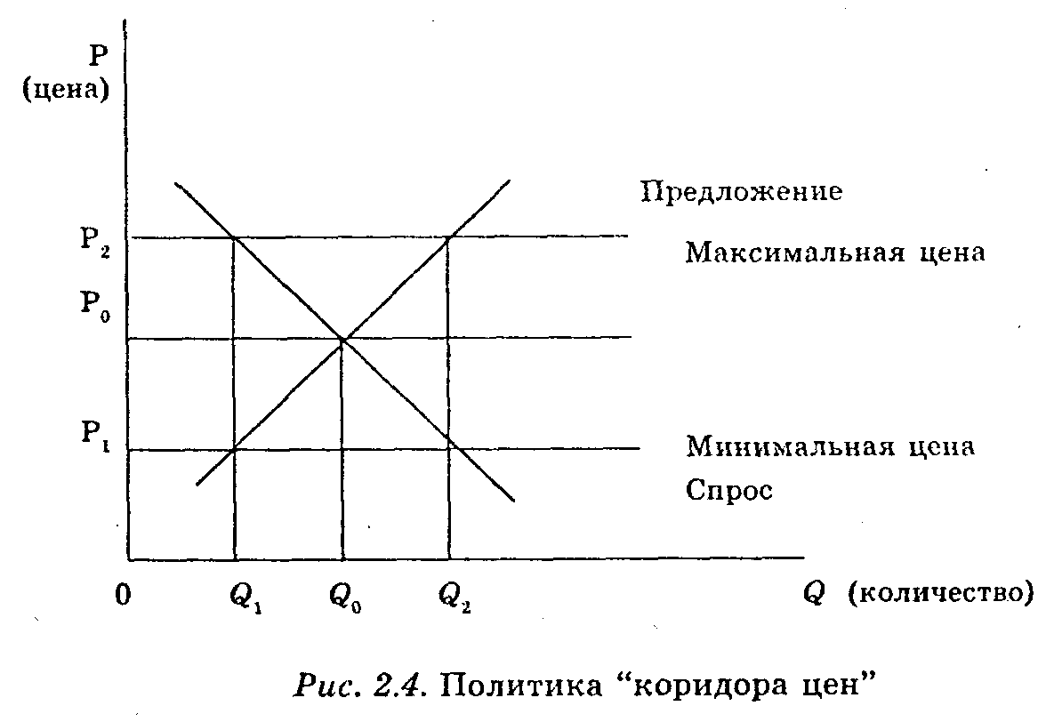 Политика "коридора цен" заключается в том, что устанавливаются два предела цен: верхний и нижний. Цены, таким образом, одновременно ограничены максимальным и минимальным