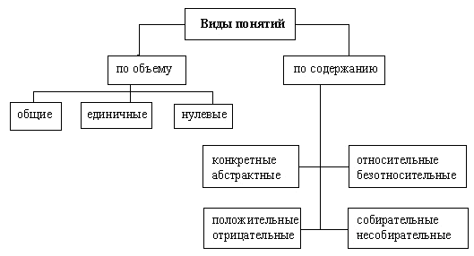 В зависимости от содержания и объема все понятия делятся на конкретные виды. Для наглядности представим их в виде схемы, а затем последовательно рассмотрим каждый вид более подробно. Единичными называются понятия, в которых мыслится один предмет (например, "великий русский писатель Александр Николаевич Островский", "Организация Объединенных Наций", "столица России" и другие).