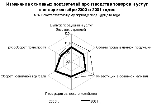 По достигнутым результатам особенно выделяется 2000 г., когда прирост ВВП составил 7,7%, продукции и услуг пяти базовых отраслей – 8, промышленной продукции – 9%. Рост охватил (хотя и в разной степени) почти все отрасли промышленности.
