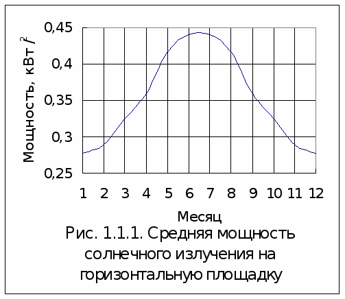Солнечное излучение зависит от времени суток и года, и прозрачности атмосферы, поэтому для ориентации солнечного коллектора необходимо иметь соответствующие среднестатистические данные. В таблице 1.1.1. приведены данные о статистическом распределении плотности солнечного излучения, которые могут быть использованы для определения положения коллектора.