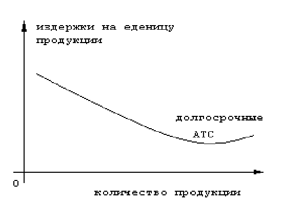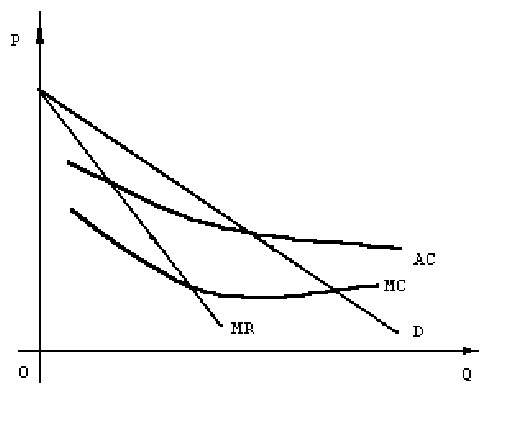 Естественная монополия существует тогда, когда эффект масштаба настолько велик, что одна фирма может снабжать весь рынок, имея более низкие издержки на единицу продукции, чем имел бы ряд конкурирующих фирм. Такие условия характерны для предприятий общественного пользования. В этих случаях эффект масштаба в производстве и распределении продукта настолько велик, что для получения низких издержек на единицу продукции и низкой цены необходима крупномасштабная деятельность. Это хорошо видно из графика. По мере значительного увеличения объема продукции падают долгосрочные средние издержки
