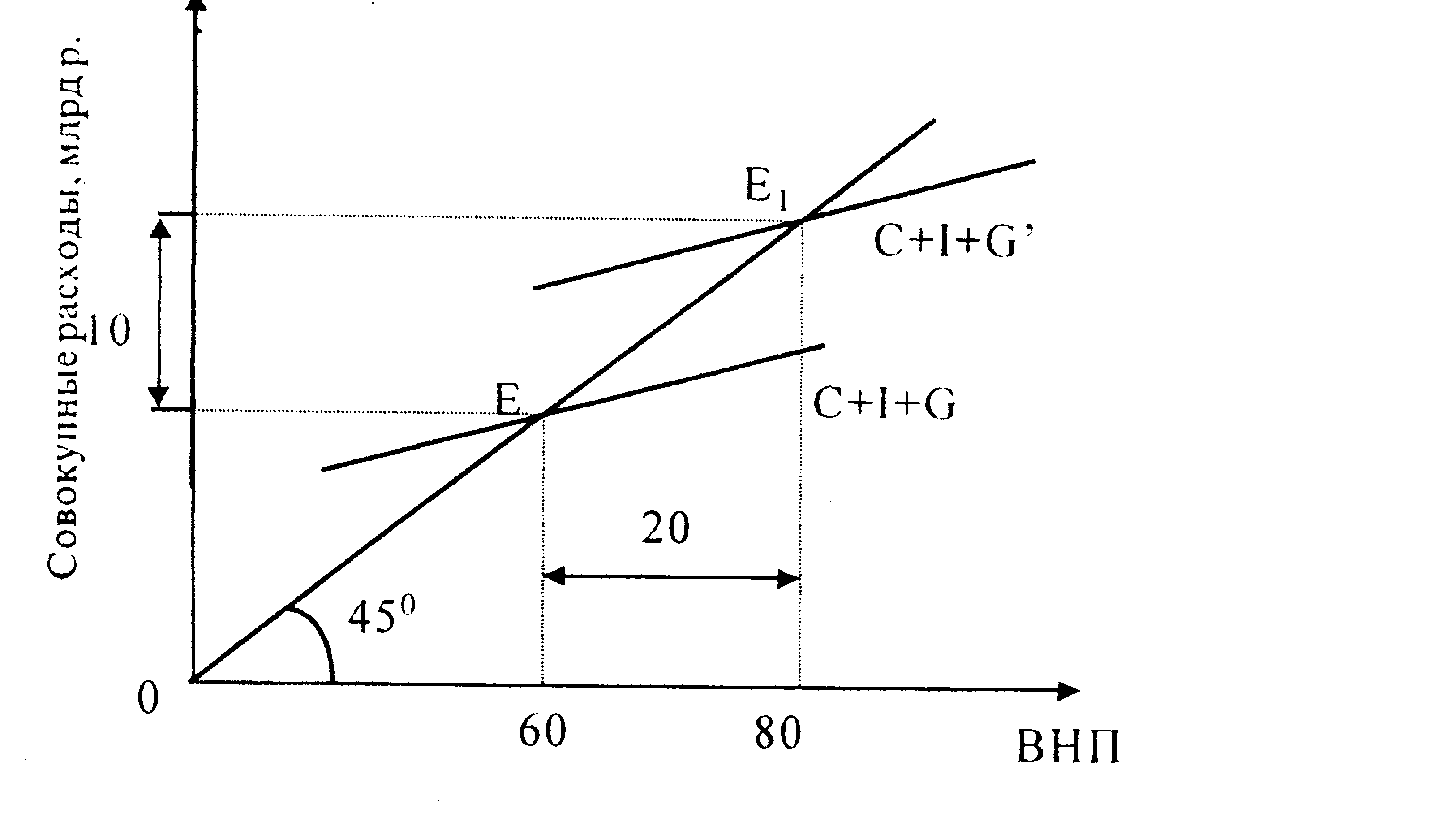 Увеличение государственных расходов (G) вызовет цепную реакцию роста совокупного спроса и увеличения ВНП. В этом примере прирост на 20 единиц приведет к приросту ВНП на 80 единиц, так как мультипликатор государственных расходов MG обратно пропорционален предельной склонности к сбережениям (если MPS =-1:4, то Мц = 4).