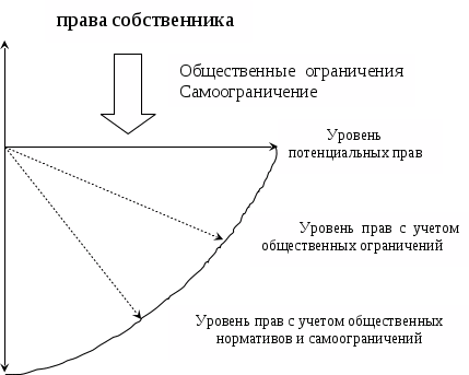 Вместе с тем возможности, права владельца всегда определенным образом ограничиваются. На рис. весь сектор (стрелка в горизонтальном положении) — это потенциальные права владельца. Реальное положение вещей складывается таким образом, что в горизонтальном положении стрелка никогда не находится: с одной стороны, общество, используя государство, всегда ограничивает права собственника, а с другой — нередко сам собственник сознательно ограничивает, уменьшает сектор своих прав на объект. Рассмотрим, в чем состоят цели и суть этих ограничений.