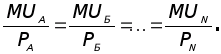 Напомним, что предельной называют дополнительную полезность, полученную от потребления каждой последующей единицы продукции. В сильную жару первый стакан газированной воды будет обладать очень высокой полезностью, второй — меньшей, а пятый может оказаться абсолютно бесполезным. Таким образом, предельная полезность обратно пропорциональна объему потребления. Как может быть использован закон убывающей предельной ценности при объяснении потребительского выбора? Предположим, что мы пришли в магазин за покупками, имея 350 тыс. руб. Предположим также, что имеется всего два товара: А и Б, цены которых соответственно 50 тыс. и 100 тыс. руб. Сколько единиц товара А и Б мы купим? Иными словами, как мы распределим наш бюджет, на покупку этих товаров исходя из их полезности? Потребительское равновесие достигается, когда отношения предельных полезностей отдельных товаров к их ценам равны. Обозначив предельную полезность через MU (англ. Marginal Utility), получим равенство: