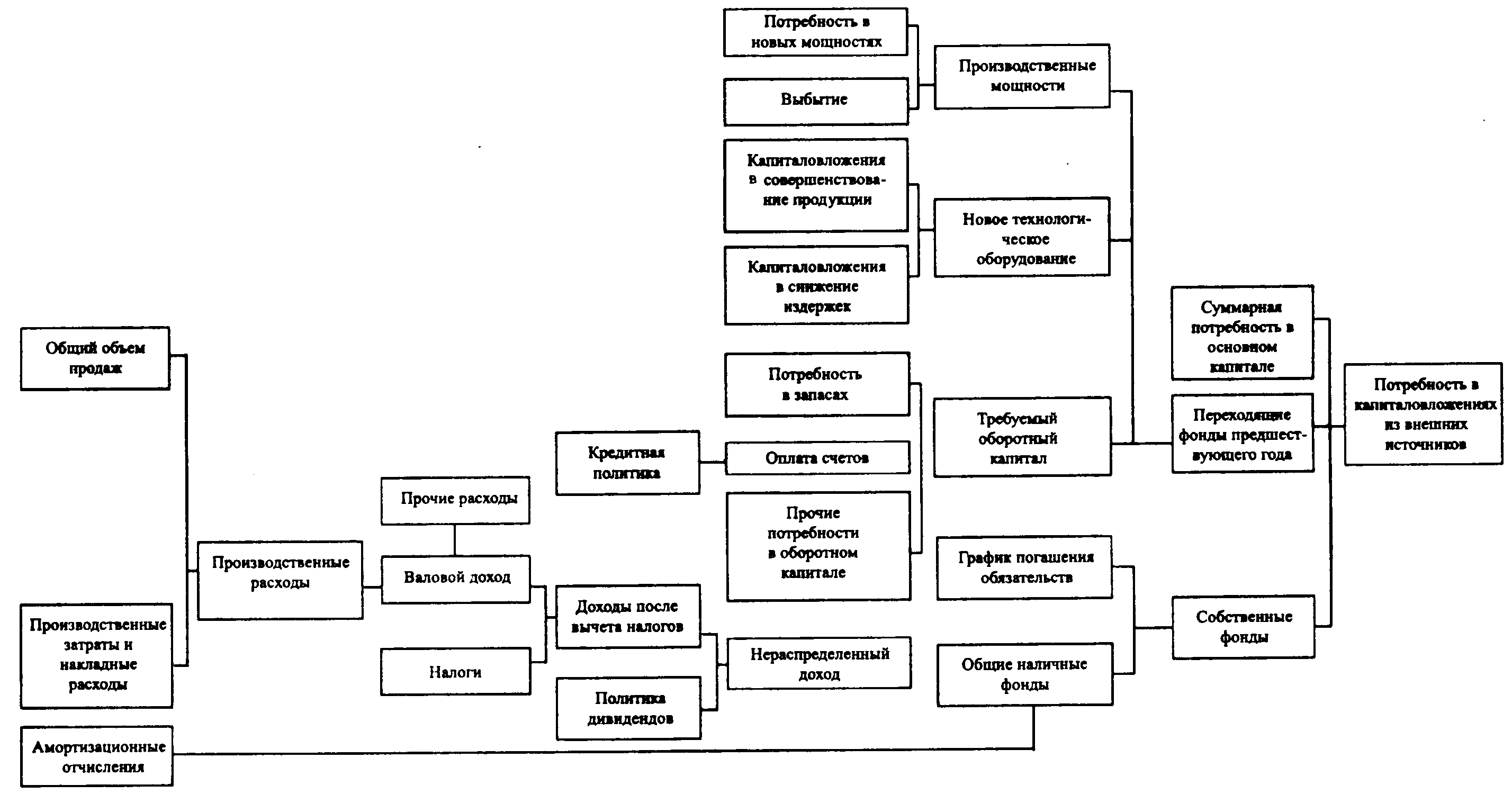 Подобные расчетные зависимости или модели могут быть составлены по каждому подразделению предприятия, виду производственных ресурсов, типу поставщика или сегменту рынка и т.п. Они могут быть использованы на всех предприятиях для расчета требуемых капитальных вложений и оценки инвестиционных последствий разнообразных плановых решений. Эти последствия можно оценивать для ряда соответствующих допущений относительно будущих условий хозяйственной деятельности. Основная структура капитальных вложений в производственную сферу предприятия представлена на рис. 5.1. Как видно, величина капитальных вложений на отдельные виды ресурсов, а также производственные затраты и конечные финансовые результаты имеют тесную взаимозависимость. Например, количество продукции, которое планируется продать на рынке, зависит от наличия производственных мощностей в будущем, что в свою очередь — от планируемого объема продаж. Аналогично издержки производства зависят от суммы капитальных вложений, инвестируемых в производственную сферу.