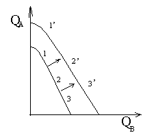 Общество вынуждено определит, какую комбинаций этих продуктов оно желает. Больше продукта А означает меньше продукта В и наоборот. Ограниченность людских ресурсов делает неосуществимой всякую комбинацию производства продукта а и В, оказывающуюся в точке, расположенной вне кривой производственных возможностей, как, например точка W.