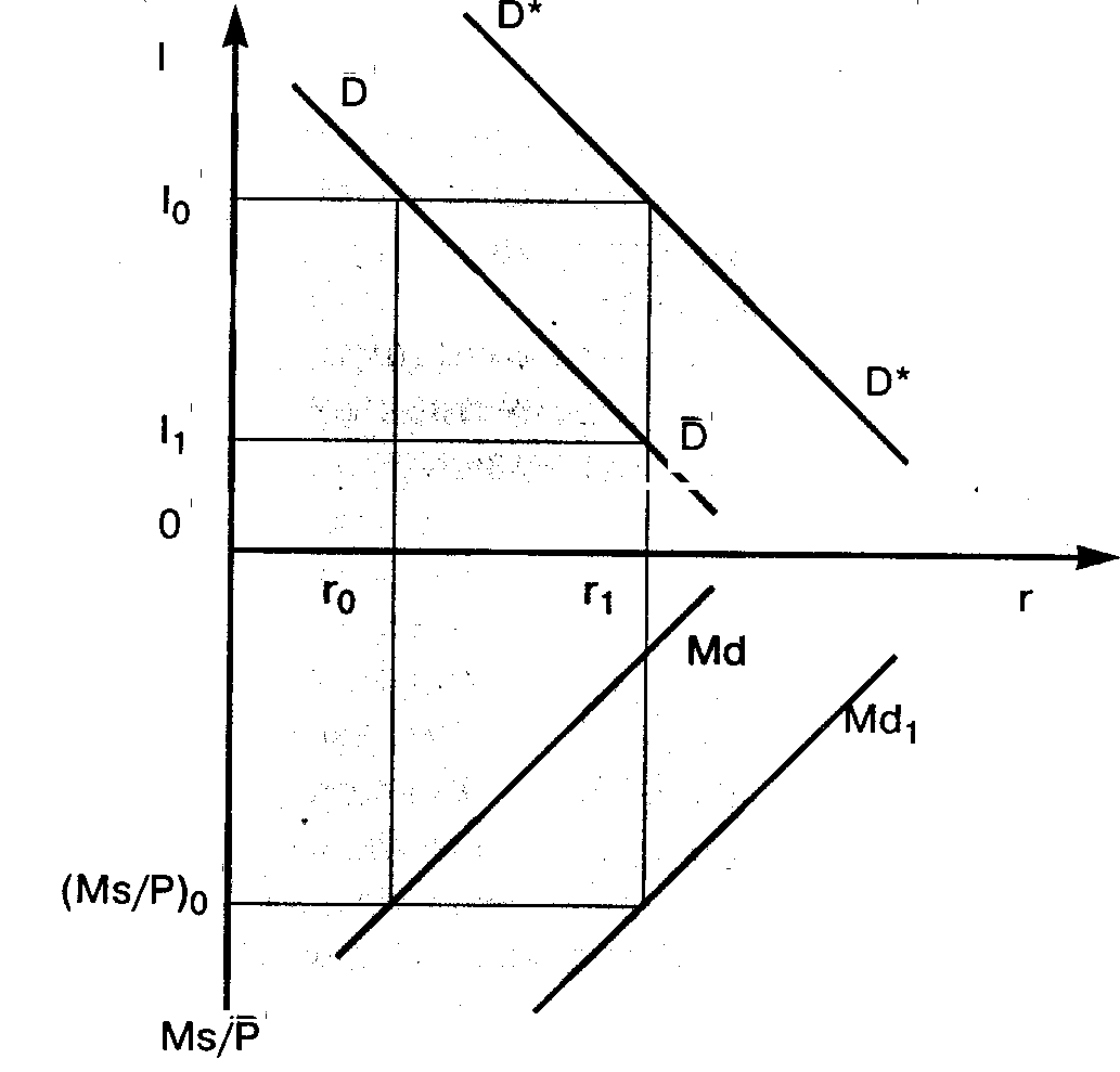Допустим теперь, что Ms/P = (Ms/P)0 = const (т.е. реальное количество денег в экономике не изменяется) и что имеет место равновесный экономический подъем. Тогда У растет и Md смещается вправо в положение Md1, a r0 увеличивается до r1; для того, чтобы сохранить равновесие денежного рынка. В результате при неизменном положении DD величина Д1о уменьшается до Д1; вызывая замедление экономического роста. Однако этого может не произойти, если DD смещается вправо в положение D*D* (или если Ms/P возрастет).