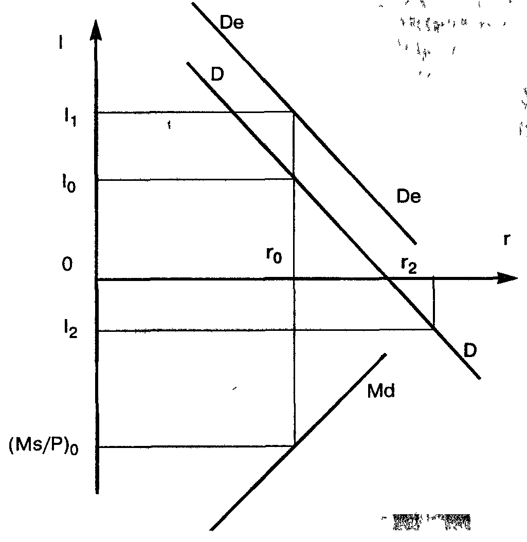 Верхняя половина изображает фондовый рынок, нижняя половина - рынок денег. DD — график спроса на инвестиции. Его отрицательный наклон означает, что спрос на инвестиции падает с ростом заемного процента. Сдвиг DD вправо вызывается улучшением