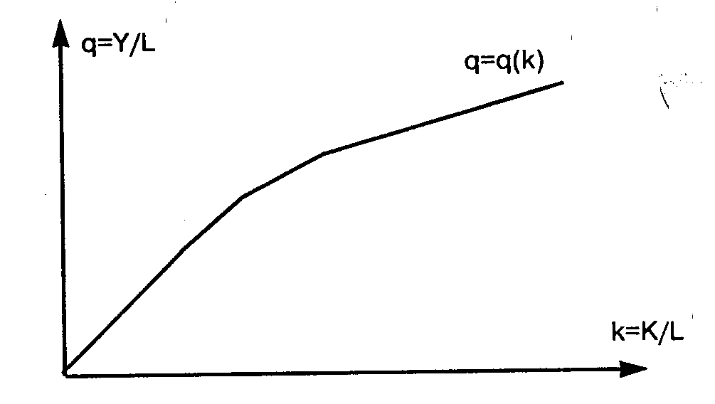 Как видим, график q растет с ростом k, но с убывающим темпом. Угол наклона этой функции равен предельной производительности капитала, которая падает с ростом К.