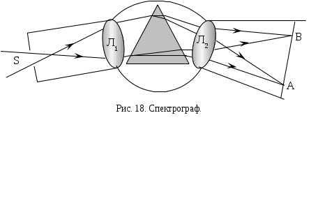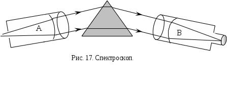 Наиболее распространенный призматический спектроскоп состоит из двух труб, между которыми помещают трехгранную призму ( рис. 17).