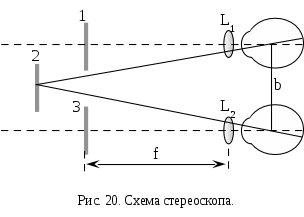 Стереоскопические снимки 1 и 2 рассматриваются с помощью линз L>1> и L>2> , помещенных каждая перед одним глазом. Снимки располагаются в фокальных плоскостях линз, и следовательно, их изображения лежат в бесконечности. Оба глаза аккомодированы на бесконечность. Изображения обоих снимков воспринимаются как один рельефный предмет, лежащий в плоскости S.