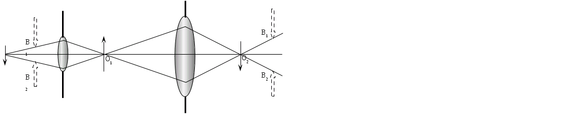 бъектив L>1> дает действительное обратное и сильно уменьшенное изображение предмета P1Q1 , лежащее около главного фокуса объектива. Окуляр помещают так , чтобы изображение предмета находилось в его главном фокусе. В этом положении окуляр играет роль лупы, при помощи которой рассматривается действительное изображение предмета.